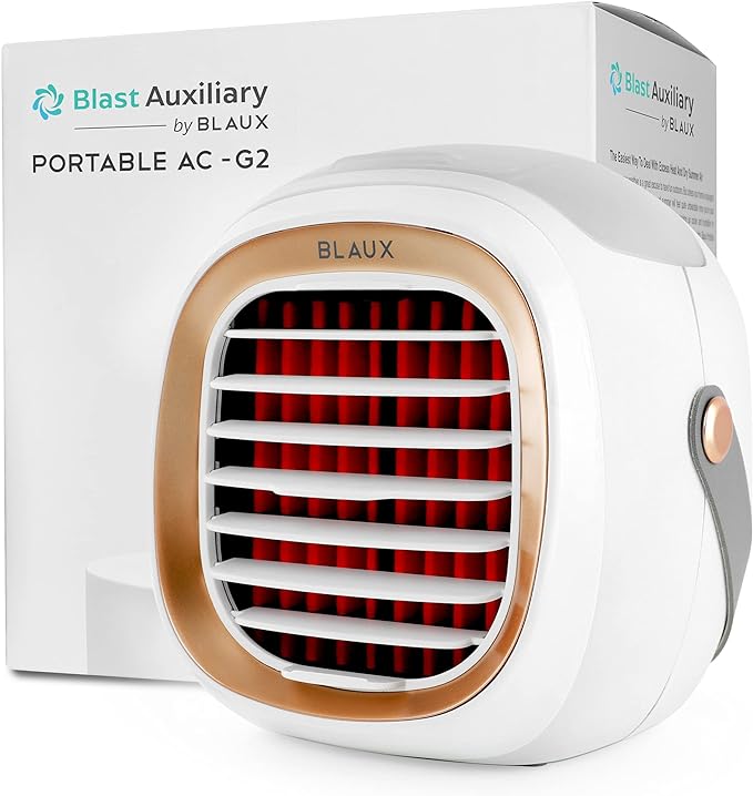 BLAST AUXILIARY PORTABLE AC, LIKE A SMALL PORTABLE AIR CONDITIONER THAT USES ICE AND WATER - Blaux Evaporative Air Cooler is an ultra-portable fan rechargeable with USB. Use the optional humidifier for ice-cool air and ultimate personal cooling. Blaux mini portable cooler has a unique rapid-cooling feature. Unlike a portable AC air conditioner, Blaux AC (air cooler) uses a water curtain that you freeze to chill the air in your personal space. Blast portable AC your personal air.
